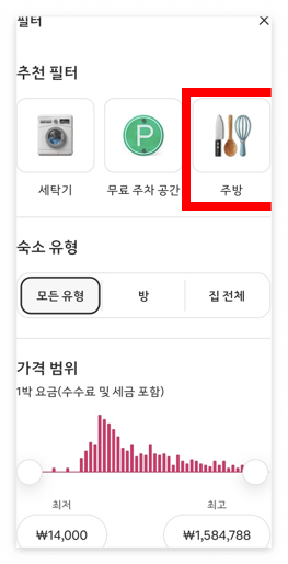 - 편의시설: 주방, 주차장, Wi-Fi 등 필요로 하는 시설을 선택할 수 있어요.